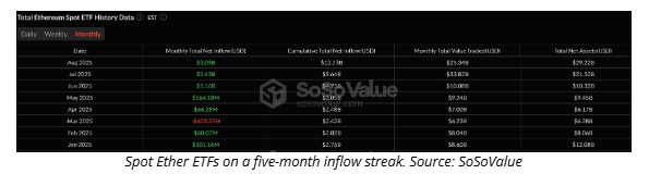 Spot Ether ETFs have now accumulated $12.73 billion in cumulative net inflows since launch and are on track for five consecutive months of net gains heading into September.