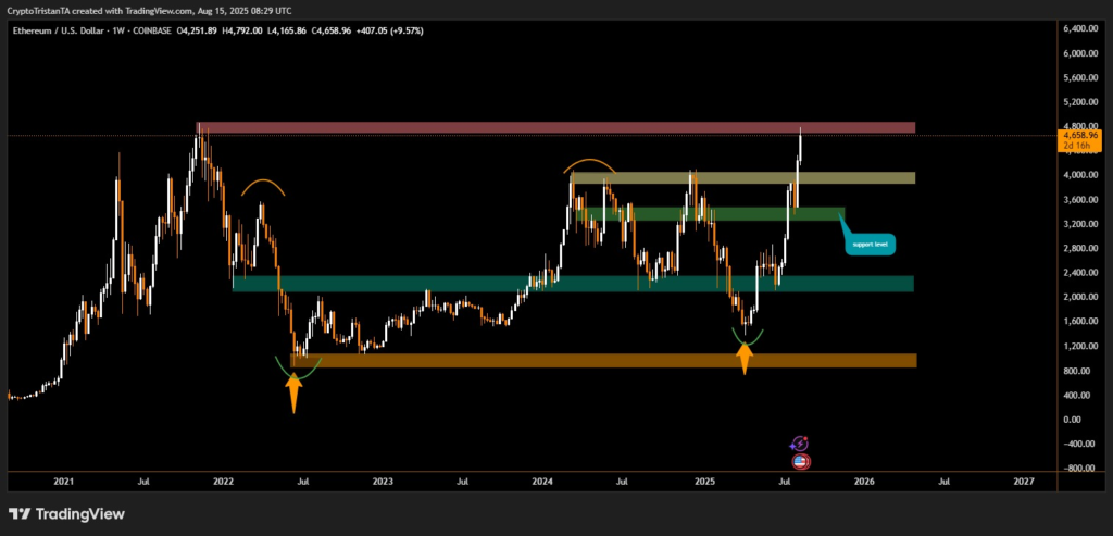 The ETF buying spree coincides with a sharp rally in Ethereum’s price. On Thursday, ETH surged to a yearly high of $4,765.83, before pulling back below $4,500 and later recovering above $4,600. The asset is up nearly 20% this week.
