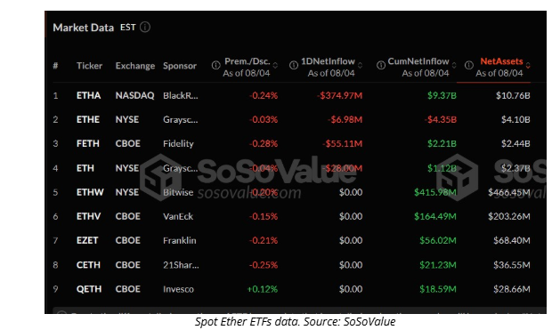 BlackRock’s ETHA led the outflows with $375 million withdrawn, while Fidelity’s FETH and Grayscale’s ETHE and Mini Trust also experienced significant redemptions.