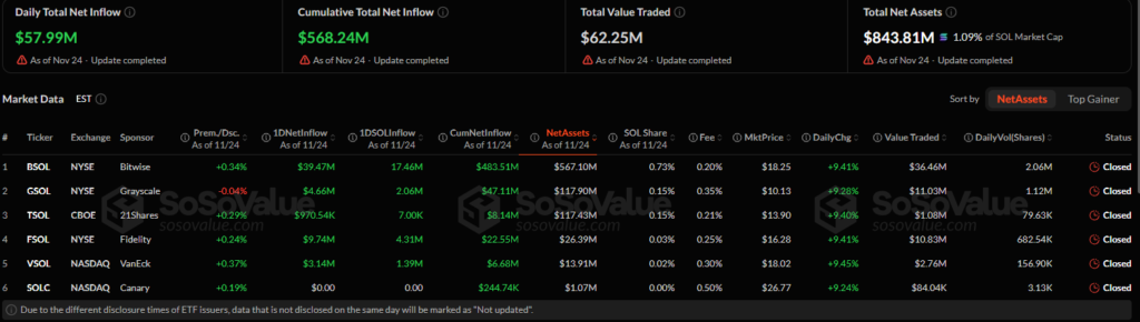 Since BSOL’s launch on Oct. 28, Solana ETFs have accumulated $568.24 million in total inflows, while their combined assets under management now stand at $843.81 million. That figure represents roughly 1.09% of Solana’s entire market capitalization, a notable milestone for a newly introduced set of products.