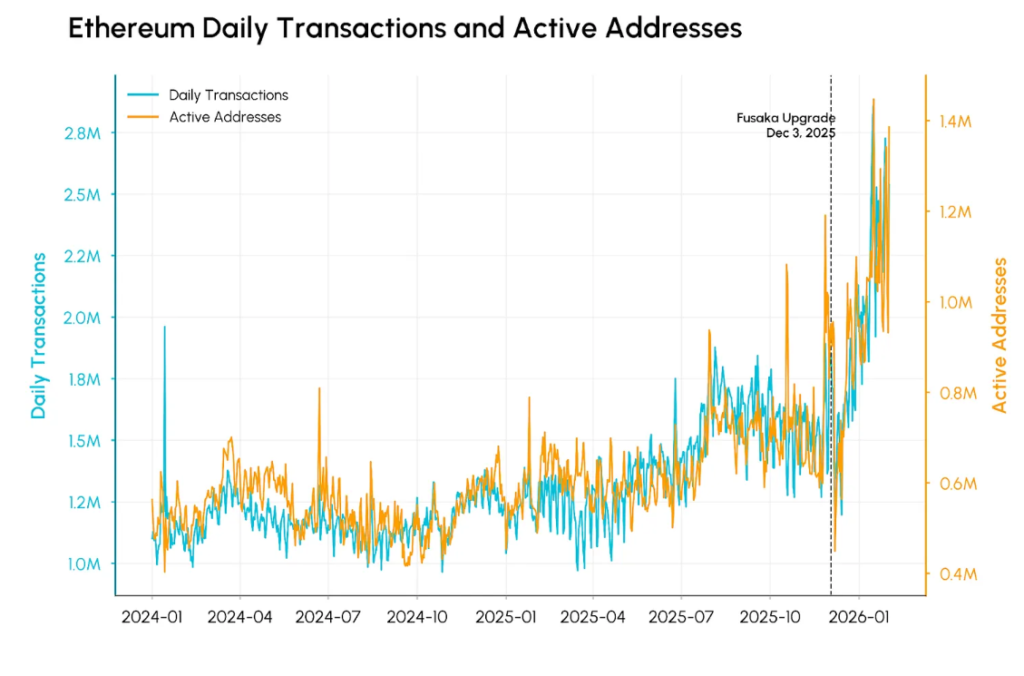 The Fusaka upgrade, implemented in December 2025, reduced transaction costs and improved onchain data handling, making it easier to post information from layer-2 networks back to Ethereum. As a result, Ethereum now averages over 2 million daily transactions, with daily active addresses reaching 1.4 million, a 60% rise compared to prior levels.