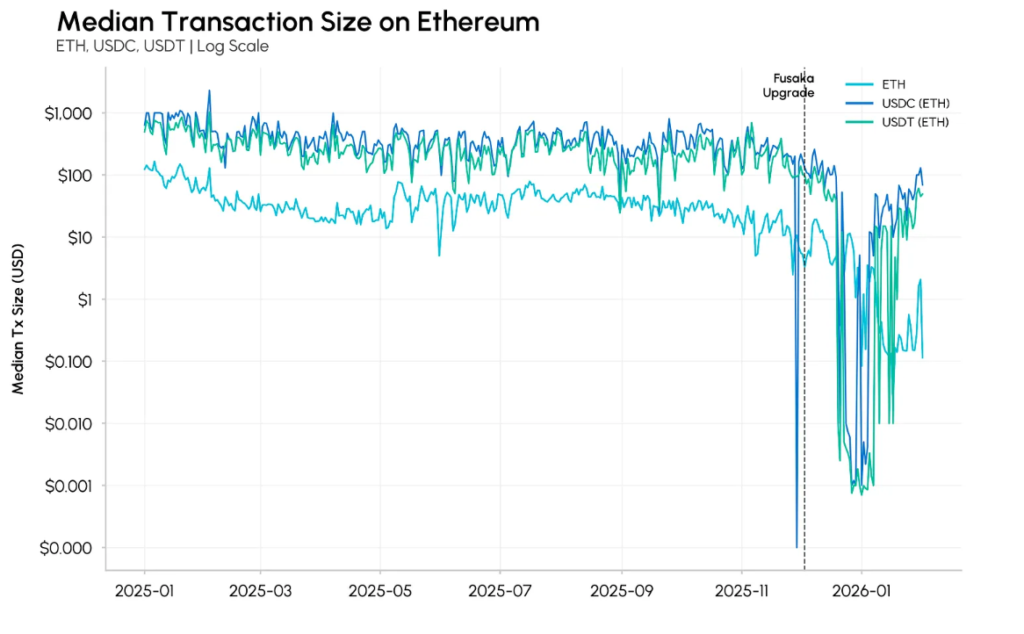 Coin Metrics analyzed 227 million balance updates for USDC and USDT from November 2025 to January 2026, finding that 43% of transfers involved amounts under $1, and 38% were below a single cent. Pre-Fusaka, these small transfers accounted for only 3–5% of transactions and 15–20% of active addresses. Post-upgrade, the figures jumped to 10–15% of transactions and 25–35% of active addresses, representing a 2–3x increase.