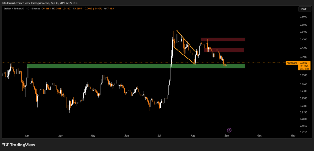 Stellar Lumens (XLM) has staged a rebound after retesting its critical support zone near $0.36, signaling renewed buying interest at a level that has historically acted as a demand base. The move comes after a period of extended selling pressure, which pushed XLM down from its recent peak above $0.50.