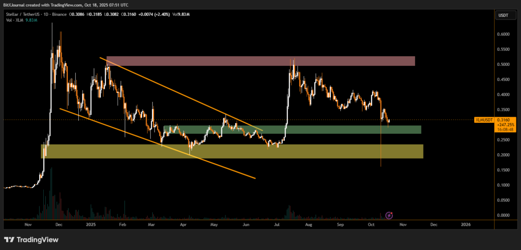 On the technical chart, XLM is testing a crucial demand zone between $0.28 and $0.31, where buyers previously defended the token after extended downtrends. The market structure shows a descending channel breakout earlier this year, but the asset has since retraced from the $0.45 resistance area, signaling possible exhaustion in short-term bullish momentum.