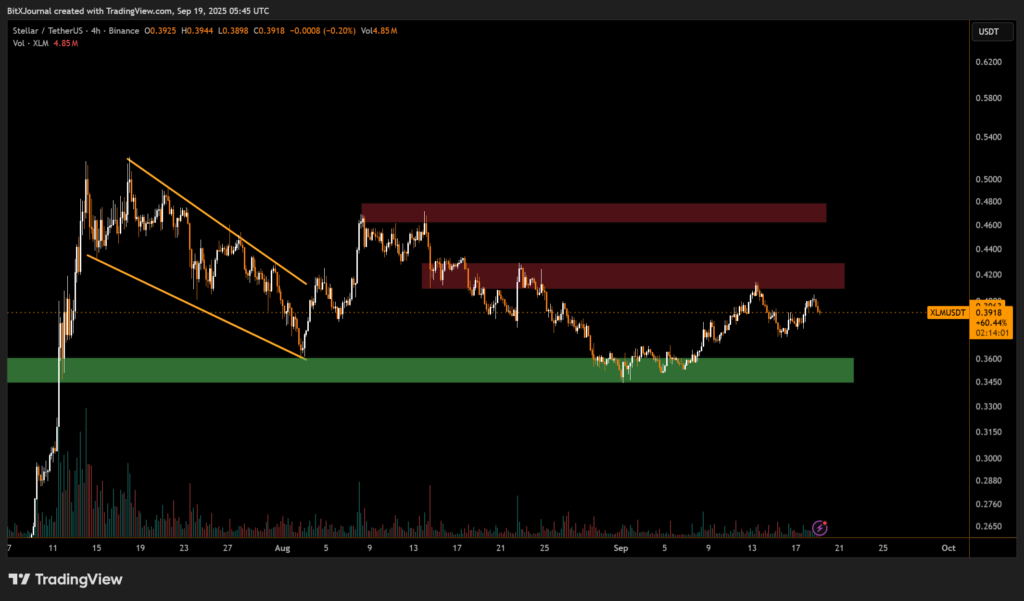 The 4-hour chart reveals that XLM rallied aggressively from the $0.34–$0.36 demand zone, breaking out of a descending channel pattern in early September. This bullish move lifted the token above $0.40, where it faced immediate resistance.