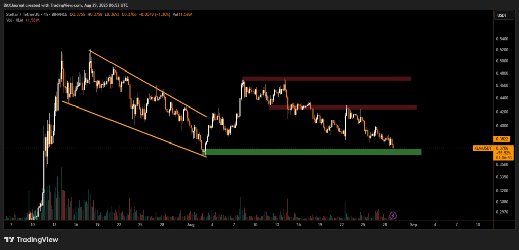 Over the past month, Stellar has faced persistent selling pressure, sliding from highs near $0.48 down toward the $0.37 support zone. Technical charts highlight a crucial green support block, where buyers have repeatedly stepped in to prevent further downside.
