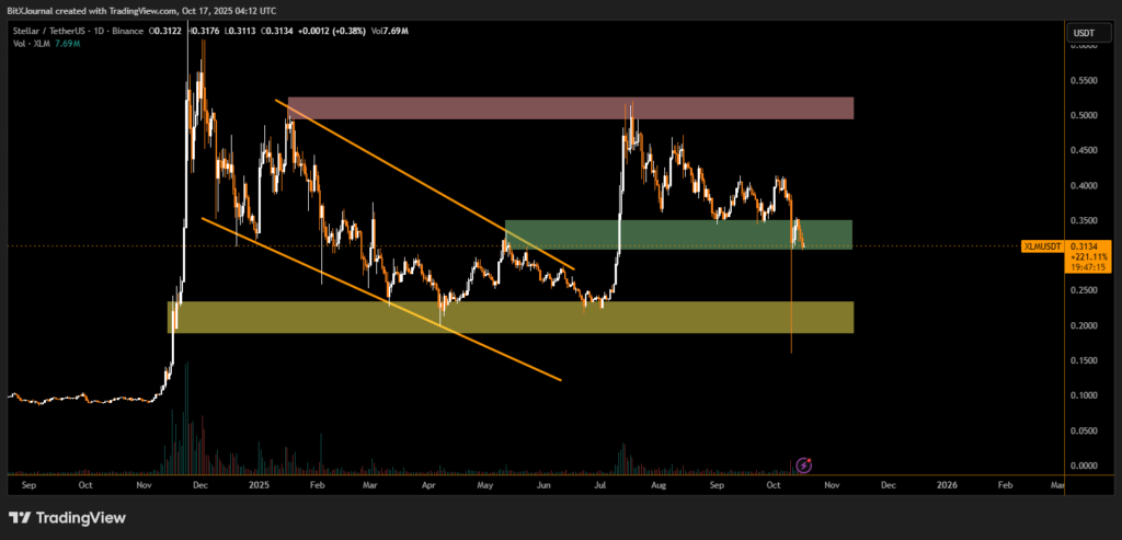 For now, the $0.31 support zone remains pivotal. A rebound from this level could trigger a short-term recovery toward $0.37–$0.40, aligning with the upper green resistance range. Conversely, losing this level might confirm a bearish continuation pattern, extending Stellar’s correction into November.