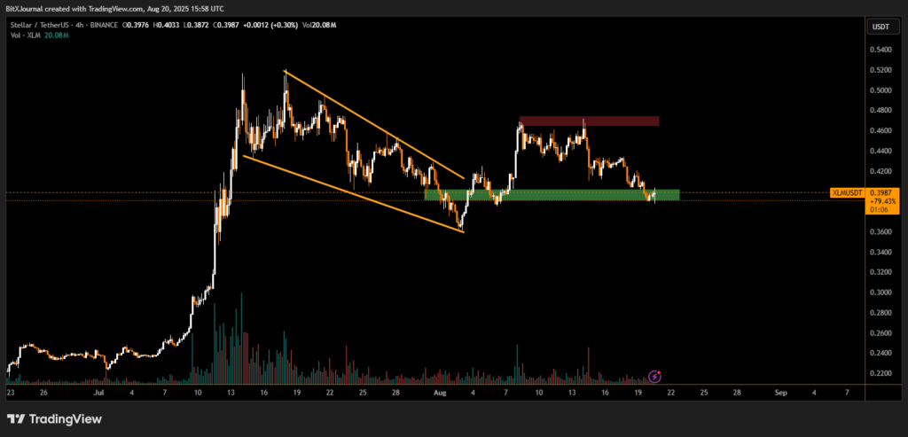 A recent pattern on the four-hour chart shows that XLM broke down from a falling wedge structure, briefly recovering before meeting strong resistance and retracing back into the green support zone. Analysts note that this consolidation phase could either trigger a rebound or reinforce the bearish structure depending on market flows.