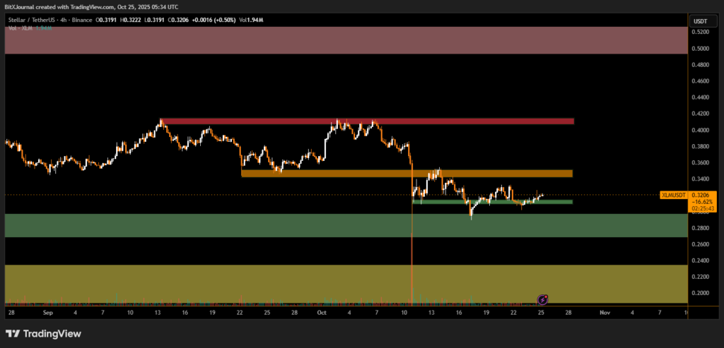 The price action marks an important development for Stellar, as the token continues to consolidate within an emerging bullish structure. On the 4-hour timeframe, XLM is currently retesting the immediate support zone between $0.312 and $0.316, a region that previously acted as resistance earlier in the week.