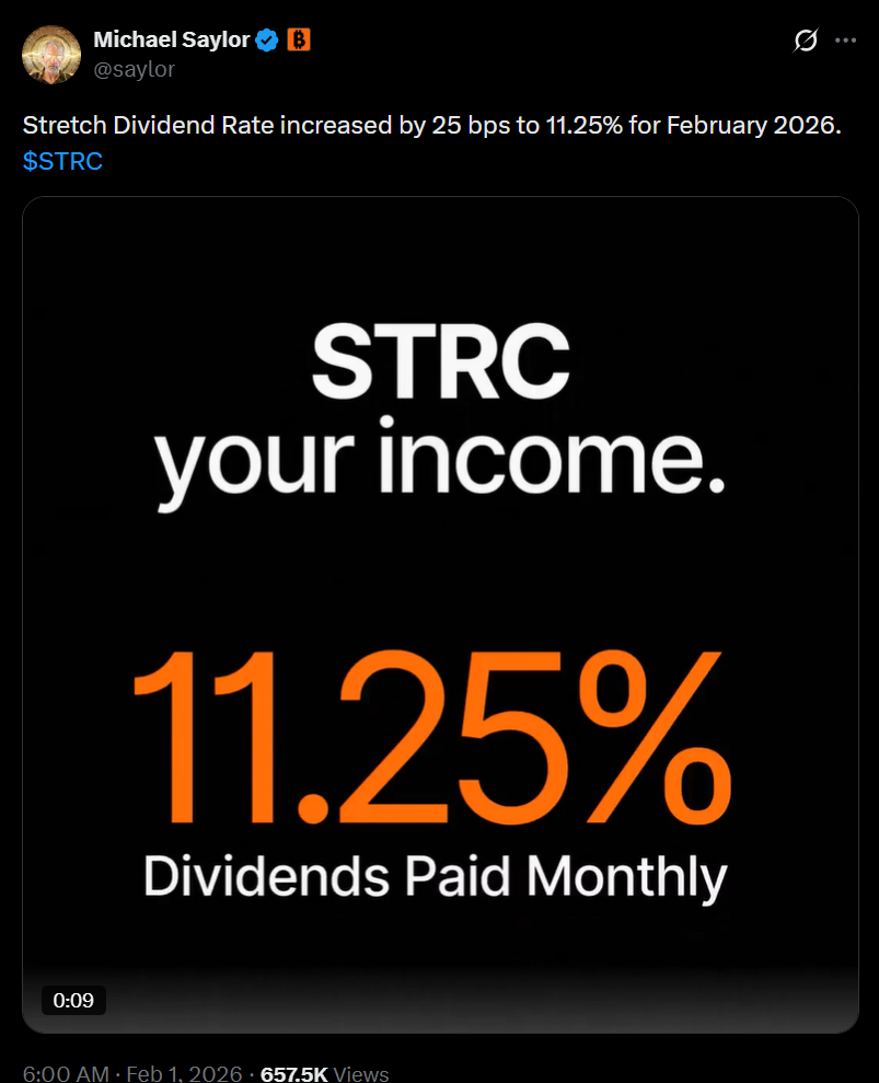 For February, Strategy lifted the STRC dividend rate by 25 basis points to 11.25%. This marks the sixth dividend adjustment since the preferred stock began trading in July 2025. STRC is structured to pay monthly cash distributions, with the rate reset regularly to help keep the share price close to par and reduce volatility. Despite this mechanism, STRC recently closed at $98.99, remaining under its $100 target level.