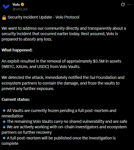 Volo Protocol, a liquid staking platform built on the Sui blockchain, reported a security breach that resulted in losses of approximately $3.5 million. The exploit targeted assets held in the platform’s WBTC, XAUm and USDC vaults, prompting immediate emergency measures to limit further damage.