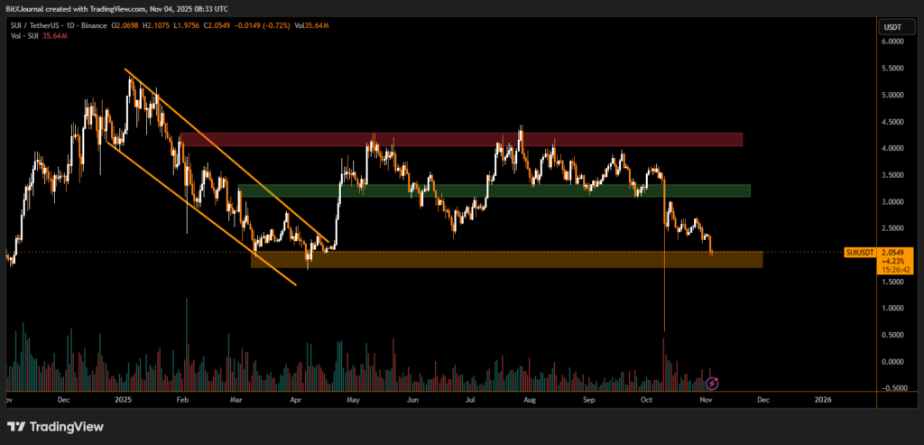 The move unfolded after price action cracked through a key accumulation block near $2.10, triggering stops and accelerating downside momentum. Trading volume surged more than six-fold, coinciding with what analysts described as institutional exit behavior rather than routine retail volatility. Though SUI managed a brief intraday bounce off the lower liquidity zone around $1.95 to $2.00, the recovery lacked follow-through.