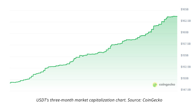 Tether’s expanding Treasury position reflects growing demand for its USD-pegged stablecoin, USDT. Data shows USDT’s market cap has risen from $137 billion to $163.6 billion since January 1, 2025—a nearly 19% increase year-to-date.