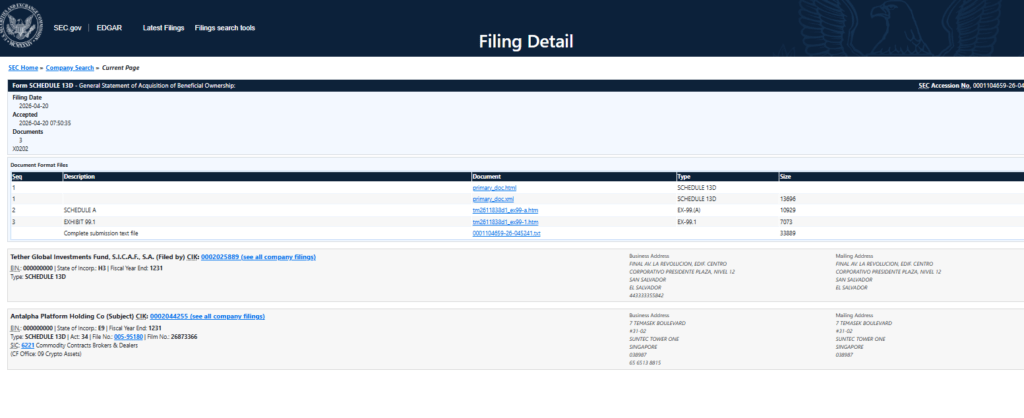 Tether has acquired an 8.2% stake in Antalpha, a Bitcoin mining finance and lending platform, becoming one of its largest shareholders following the company’s May 2025 initial public offering. According to a filing with the US Securities and Exchange Commission, Tether now holds approximately 1.95 million shares through affiliated entities, with chairman Giancarlo Devasini holding shared voting and decision-making authority over the position.