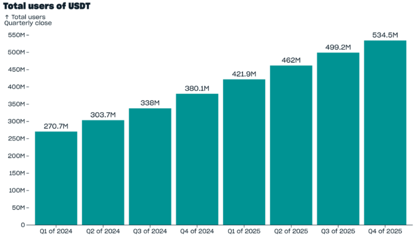 While the broader crypto market has fallen roughly 30% since October, Tether continues to report steady expansion of its USDT stablecoin. In the fourth quarter of 2025, total USDT users reached 534.5 million, with 35.2 million new users added during the period. This marks the eighth consecutive quarter with growth exceeding 30 million accounts.