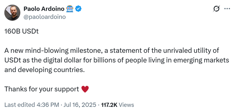 Tether’s USDt, the largest stablecoin by market capitalization, has officially crossed the $160 billion mark, solidifying its reputation as the leading digital dollar alternative across emerging markets and global crypto ecosystems.