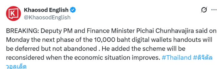 The announcement was made by Deputy Prime Minister and Finance Minister Pichai Chunhavajira during an investment seminar in Bangkok on May 26, according to reports from Bangkok Post and The Nation.