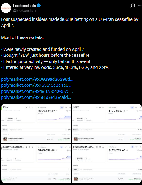 Three newly created wallets on the prediction market Polymarket profited a combined $484,575 by betting that the United States and Iran would agree to a ceasefire by April 7. According to blockchain analytics firm Lookonchain, the wallets had no prior on-chain activity before placing “yes” bets on the market.