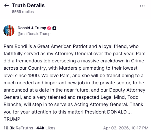 President Donald Trump removed Attorney General Pam Bondi and appointed Todd Blanche as the interim Attorney General, placing the former deputy and Trump’s personal attorney in charge of the Department of Justice. Blanche previously represented Trump in his 2024 criminal case in New York and was named deputy attorney general after Trump retook office.