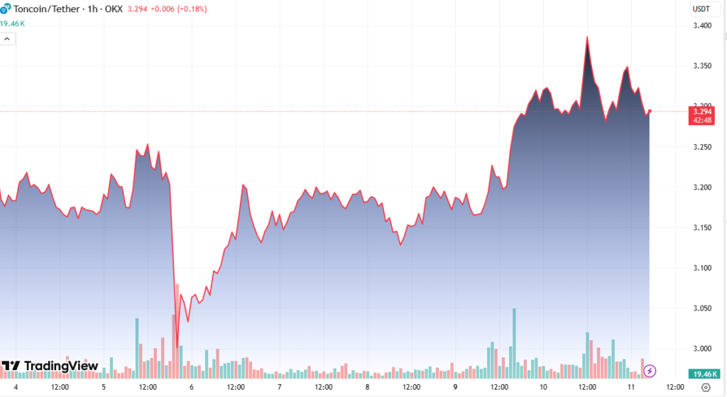 The price action formed a clean uptrend characterized by higher lows and higher highs, signaling the continuation of bullish sentiment. A decisive break above the $3.33 resistance level added further conviction to the move, with volume rising to 5.77 million TON tokens traded, well above the 24-hour average.