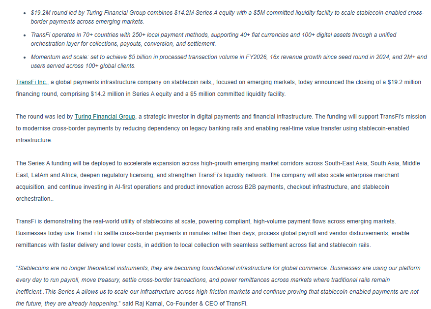 Stablecoin payments firm TransFi has raised $19.2 million in new funding to scale its cross-border payments platform. The round includes $14.2 million in Series A equity alongside a $5 million liquidity facility, aimed at strengthening operations and expanding reach. The company plans to target key regions including Southeast Asia, South Asia, the Middle East, Latin America and Africa.