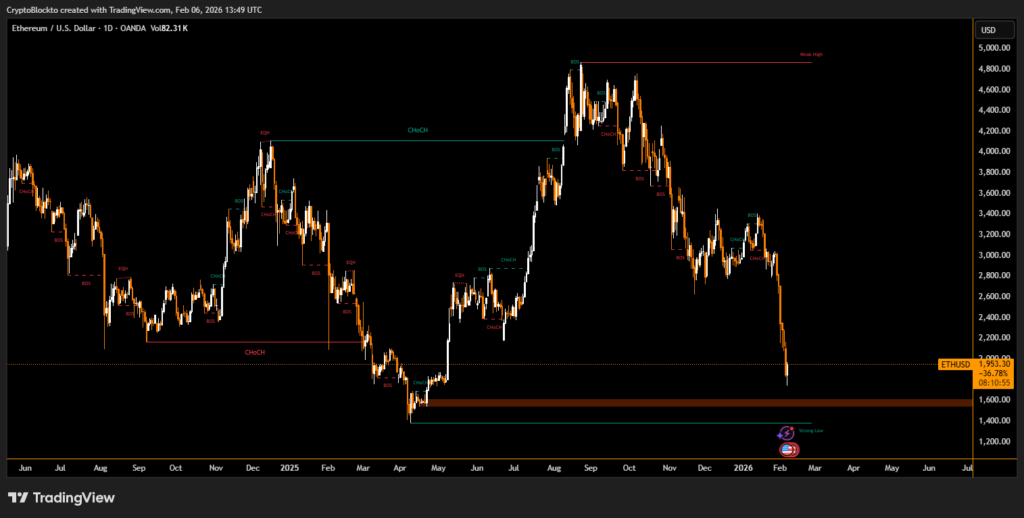 The sell-off coincided with a sharp drop in Ether’s price, which fell nearly 30% over seven days and briefly touched levels near $1,750 before rebounding closer to $2,000. The decline placed pressure on leveraged positions tied to decentralized lending platforms.