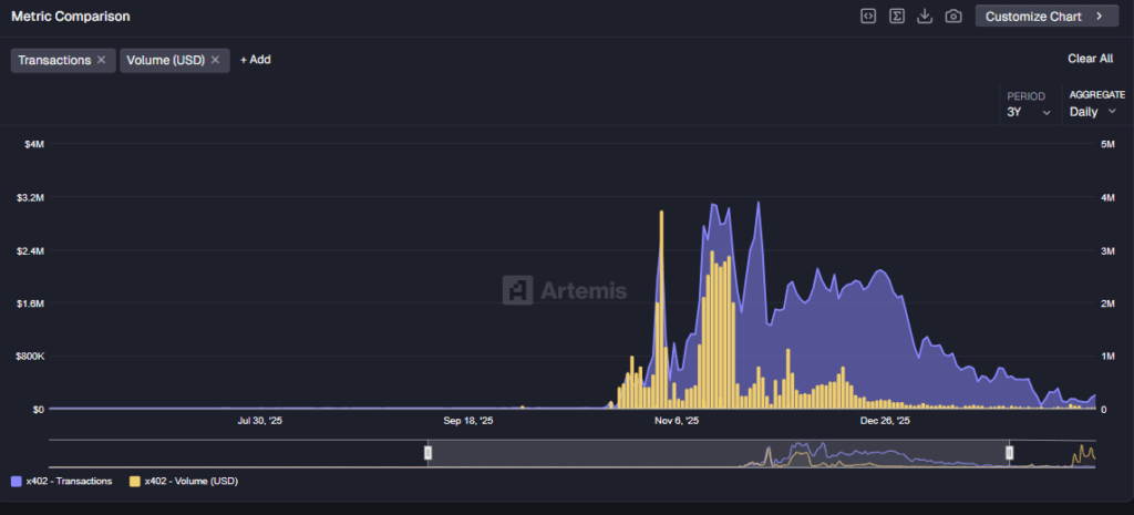 Agentic payment volume on the x402 protocol has spiked recently: Artemis