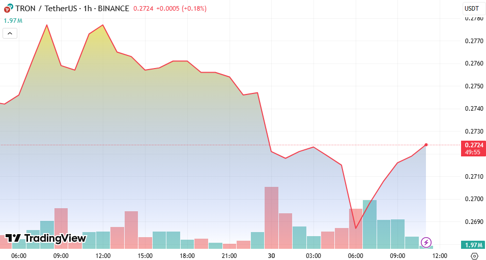 Despite the downward movement, short-term support for TRX appears to be holding near the $0.268–$0.270 range. Buyers stepped in as the price briefly dipped below $0.27, causing a minor rebound.