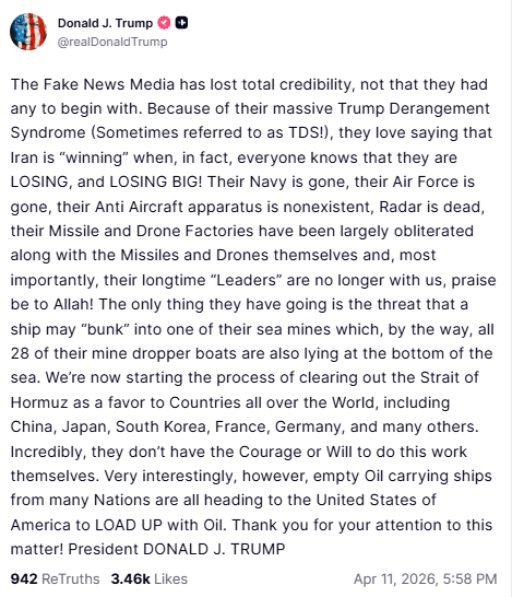 Donald Trump continued posting sharp remarks online about Iran while diplomatic negotiations were underway in Islamabad. Writing on his social platform Truth Social, Trump rejected media reports suggesting Iran had gained an advantage, instead claiming the country was “losing big.”