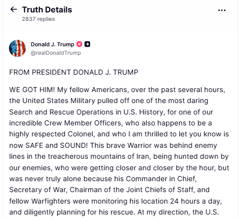 US President Donald Trump confirmed that an American officer, missing after his F-15E fighter jet was downed over Iran, has been rescued and is “safe and sound.” Speaking on Truth Social, Trump described the operation as “one of the most daring Search and Rescue Operations in U.S. History” and identified the rescued officer as a “highly respected Colonel.”