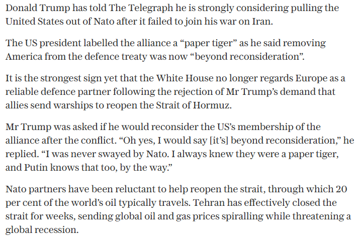 US President Donald Trump said he is strongly considering withdrawing the United States from the North Atlantic Treaty Organization (NATO) after allies declined to support his military demands during the Iran conflict. He described NATO as a “paper tiger” and said leaving the alliance was now “beyond reconsideration,” signaling growing frustration with European partners.