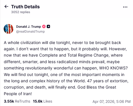 U.S. President Donald Trump threatened on Tuesday that Iran’s “whole civilization will die tonight” if it does not reopen the Strait of Hormuz by his 8 p.m. ET deadline. Trump described the moment as “one of the most important in the long and complex history of the world” in a post on his social media platform, Truth Social.
