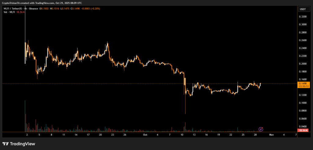 At the time of writing, WLFI trades at $0.14, showing a modest 0.5% daily decline and remaining nearly 70% below its all-time high of $0.46 recorded in September.