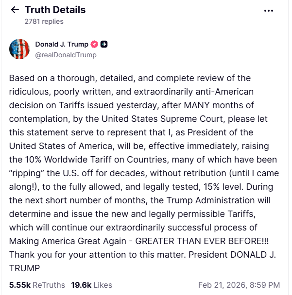 U.S. President Donald Trump announced an immediate increase in the global tariff rate from 10% to 15%, citing alternative legal authority after a Supreme Court ruling limited his ability to impose broad tariffs under the International Emergency Economic Powers Act.