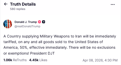 Trump also warned that if any country supplying military weapons to Iran will be immediately tariffed, on any and all goods sold to the United States of America, 50%, effective immediately.