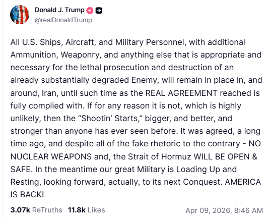 U.S. President Donald Trump stated on April 8 that American military ships, aircraft, and personnel will remain stationed in and around Iran to enforce compliance with a previously agreed ceasefire. Speaking on Truth Social, Trump warned that if Iran fails to fully comply with the deal, the U.S. will escalate military action. “If for any reason it is not, which is highly unlikely, then the ‘Shootin’ Starts,’ bigger, and better, and stronger than anyone has ever seen before,” he said.