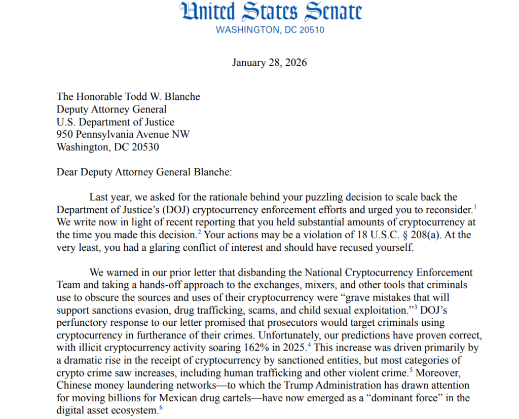 Six U.S. Senators have sent a letter to Deputy Attorney General Todd W. Blanche, seeking details regarding potential conflicts of interest in his decision to scale back the Department of Justice’s cryptocurrency enforcement. The letter raises concerns that Blanche held significant cryptocurrency holdings while directing the disbanding of the DOJ’s National Cryptocurrency Enforcement Team.