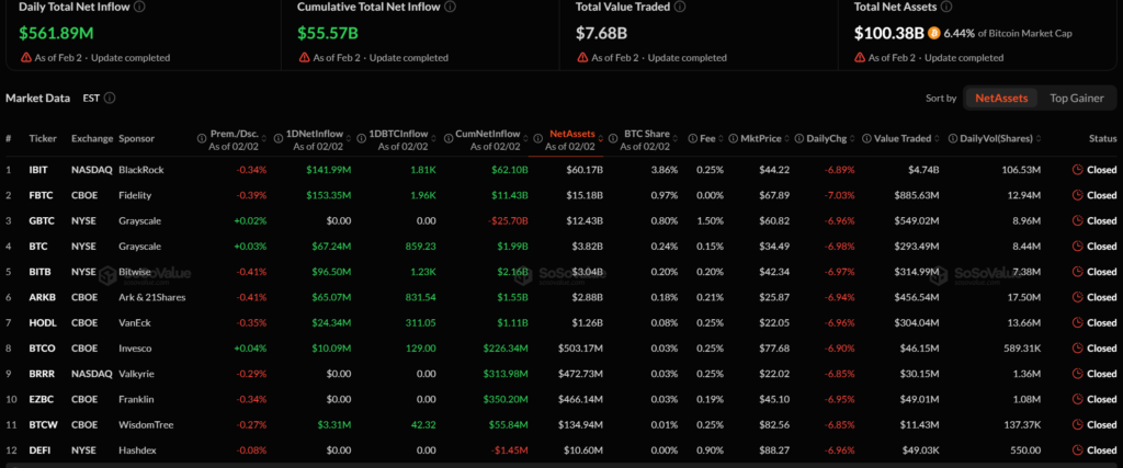 U.S. spot Bitcoin exchange-traded funds (ETFs) recorded $561.9 million in net inflows on Monday, reversing a four-day streak of outflows and marking the largest single-day intake since mid-January. The inflows coincide with continued Bitcoin price volatility and suggest renewed confidence among institutional investors.