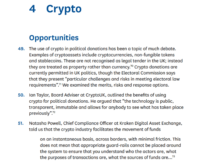 The report emphasizes the need for robust regulations before permitting crypto in UK politics.