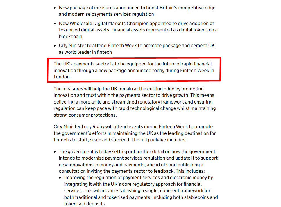The Treasury also confirmed plans to consult on reforms to payment services and electronic money regulation under the broader “Leeds Reforms” and the UK’s 10-year financial services strategy aimed at positioning the country as a global hub for fintech and digital assets.