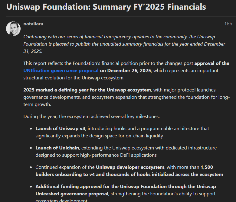 The Uniswap Foundation reported total assets of approximately $85.8 million as of Dec. 31, 2025, projecting that current funding will support operations through January 2027. The figures were disclosed in an unaudited financial summary published on its governance forum, outlining the organization’s financial strength and long-term planning strategy.