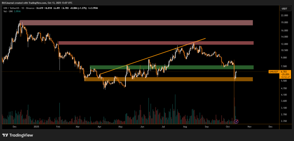 The daily chart reveals a clean reaction from the orange support area between $5.50 and $6.00, which has consistently served as a major demand zone throughout 2025. Following the steep sell-off earlier in October, UNI’s price quickly recovered above the $6.70 mark, suggesting that sellers may have exhausted near-term pressure.