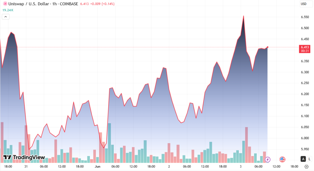 Uniswap’s native token, UNI, surged over 5% to break past key resistance at $6.37, defying global macroeconomic concerns, including renewed tariff tensions. The rally was driven by a spike in buying volume, as investors rotated into altcoins despite broader market uncertainty.