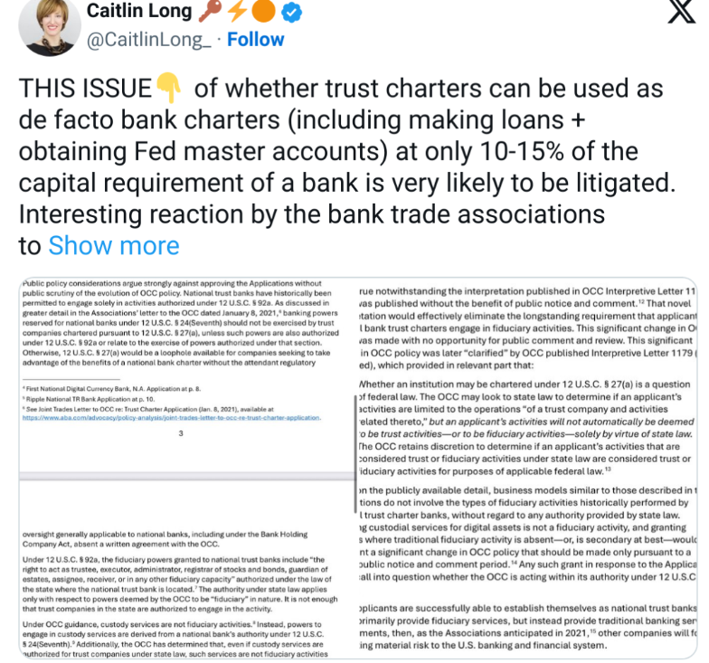 Industry watchers believe the issue could escalate into litigation. Custodia Bank founder Caitlin Long highlighted the tension, noting that if crypto firms are approved for these charters, traditional banks may be incentivized to convert into trust companies, operating under lighter regulation.