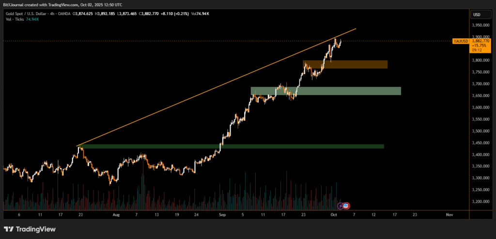 Safe-haven demand drove gold to a record $3,898 an ounce, climbing nearly 1% before easing slightly. Investors see bullion as a hedge against both political and economic uncertainty.