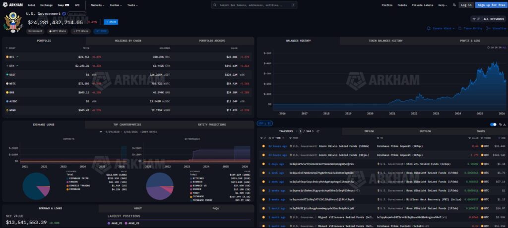 The United States government transferred 2.438 Bitcoin (BTC), worth about $177,000, to a Coinbase Prime address in two separate transactions, according to blockchain data tracked by Arkham Intelligence. The funds originated from wallets labeled “U.S. Government: Glenn Olivio Seized Funds,” suggesting the assets were confiscated during a criminal investigation. Such transfers are commonly used to consolidate, secure, or manage cryptocurrency obtained through legal forfeiture actions.