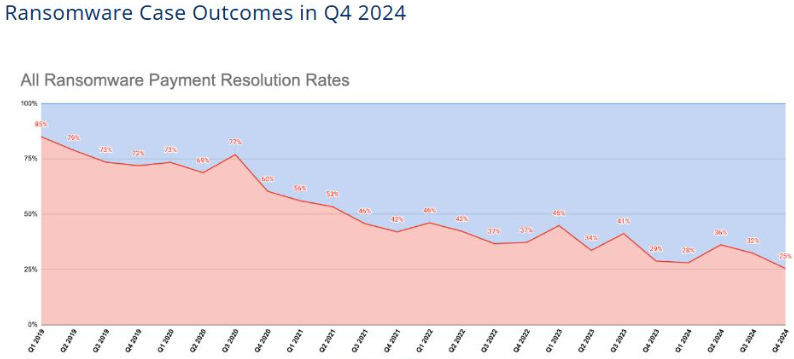 - In Q4 2024, only 25% of companies paid the ransom, according to Coveware.