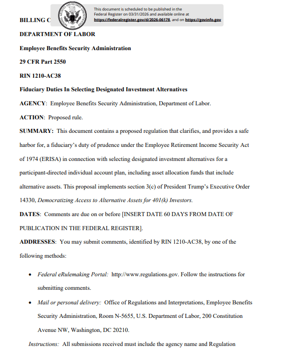 Labor Secretary Lori Chavez-DeRemer said the proposal demonstrates how retirement plans can include products that “better reflect the investment landscape as it exists today,” adding that this “greater diversity will drive innovation and result in a major win for American workers, retirees, and their families.”