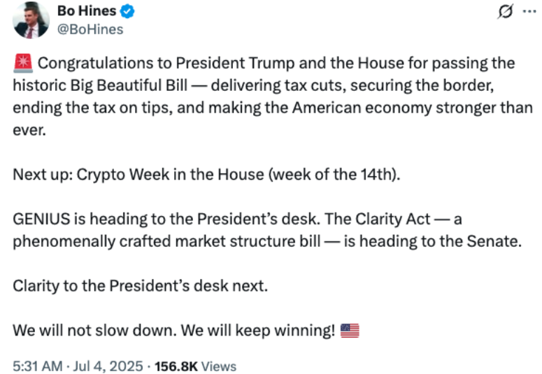 Advanced by the House Financial Services and Agriculture Committees on June 10, the bill still awaits Senate approval. Bo Hines, a top crypto policy advisor at the White House, expects the CLARITY Act to swiftly pass the House.