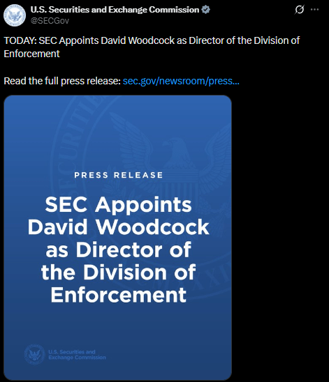 SEC Chair Paul Atkins stated that the appointment aligns with the agency’s focus on prioritizing enforcement actions that strengthen market integrity and protect investors. Woodcock said he intends to implement the chairman’s strategic vision once he takes office.